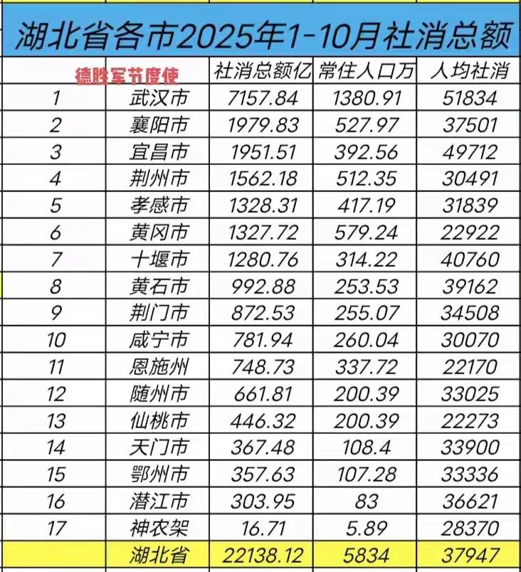 1-10月湖北各市的社会消费品零售总额排名